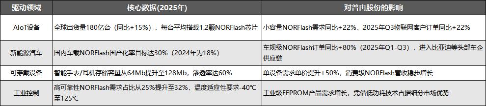 下游多领域需求的持续爆发,形成了对NORFlash存储芯片的全方位拉动,其中AIoT是核心驱动力量,新能源汽车、工业控制则为行业提供了稳定的增长基础,具体影响如下表所示: