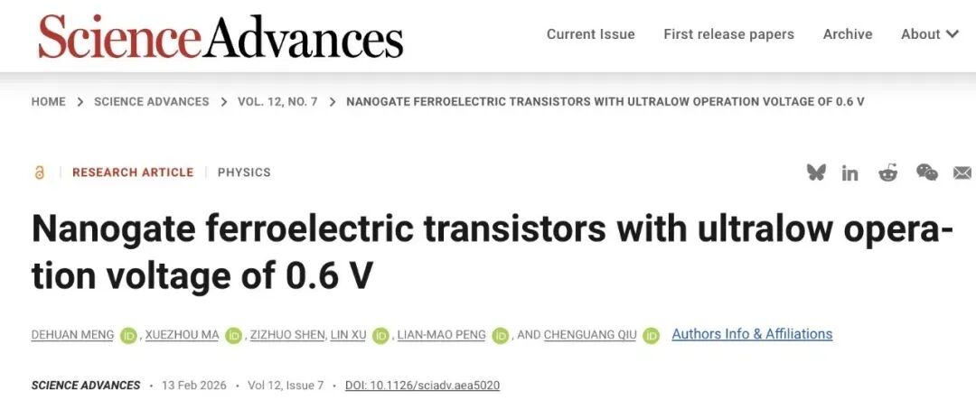 IT之家 2 月 16 日消息,据北京大学官方账号昨日分享,该校在非易失性存储器领域取得突破性进展,电子学院邱晨光-彭练矛团队首次提出“纳米栅超低功耗铁电晶体管”,真正实现了超低功耗下的数据高效存储,相关成果日前发表于《科学 · 进展》。