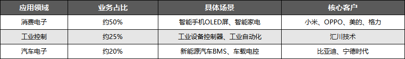 公司下游应用覆盖消费、工业、汽车三大领域,客户结构均衡,标杆客户的合作既验证了产品技术实力,也提升了品牌影响力,具体如下: