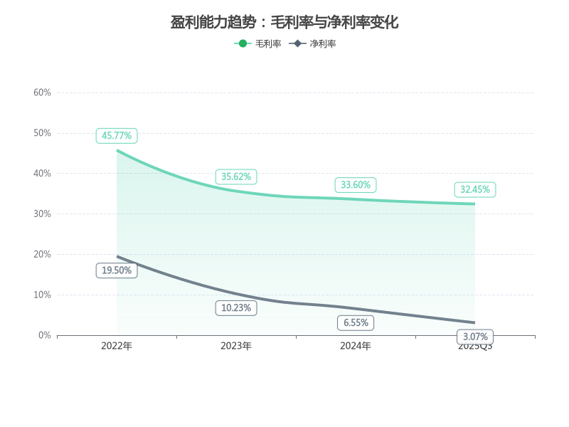2025Q3公司盈利质量有所承压,毛利率达32.45%,较2022年下降13.32个百分点;净利率达3.07%,较2022年下降16.43个百分点,且毛利率低于半导体行业平均水平(38%)。
