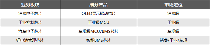中颖电子布局四大业务板块,形成消费+工业+汽车的多领域产品格局,各板块协同互补,有效提升公司抗风险能力,具体如下: