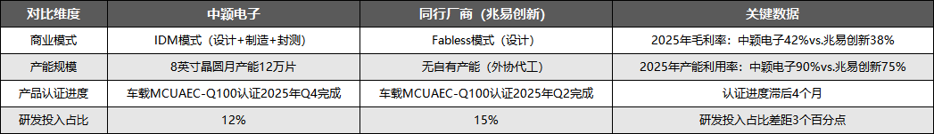 中颖电子虽在毛利率、产能利用率上具备优势,但在车载MCU认证进度、高端领域研发投入上落后于兆易创新,导致车载MCU营收占比不足2%,而兆易创新达5%,在高端MCU领域的拓展进度有待加快。