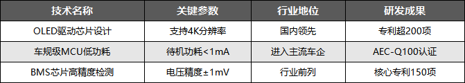 公司在OLED驱动芯片、车规级MCU、BMS芯片等核心领域形成深厚技术壁垒,关键技术参数优于行业平均,专利布局完善,成为核心竞争力的核心支撑,具体如下: