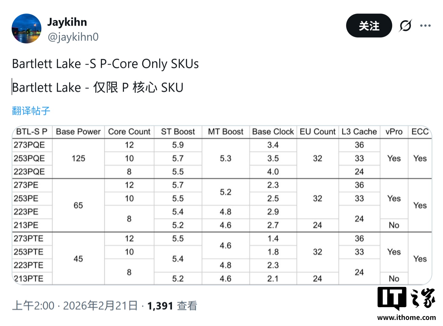 IT之家 2 月 21 日消息,消息源 @jaykihn0 今天(2 月 21 日)在 X 平台发布推文,整理发布了一张规格表,罗列了英特尔 Bartlett Lake-S 酷睿 200E 系列处理器阵容。