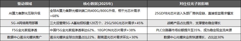 下游多领域需求的持续爆发,形成了对光通信芯片的全方位拉动,其中AI数据中心是核心驱动力量,5G-A、F5G则为行业提供了稳定的增长基础,具体影响如下表所示: