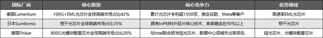 竞争格局方面,当前全球光通信芯片市场呈现“国际寡头垄断,国内龙头突围”的格局。国际市场上,Lumentum、Sumitomo、Finisar等国际巨头占据了全球高端光芯片市场90%以上的份额,其核心优势如下表所示: