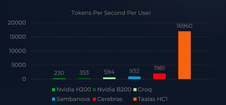 巴伊奇给出了一组测试数据,Taalas自己在Llama 3.1 8B上测试了英伟达的主力产品H200和B200,结果为230 tokens/秒和353 tokens/秒,而Taalas的HC1性能是它们的48倍。