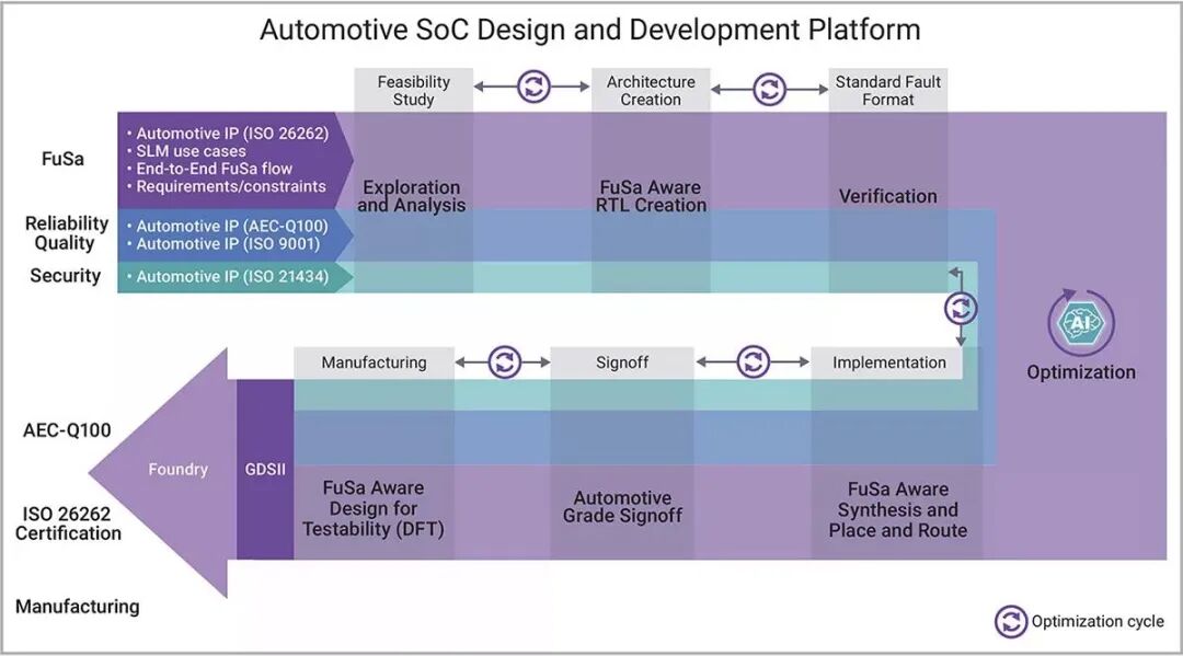 汽车 SoC 设计与开发平台整合了多种流程,以确保设计和开发的成功,重点强调功能安全、可靠性、质量和安全性。