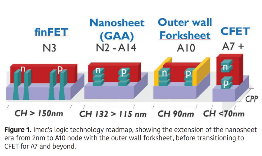 Imec 预计将在逻辑技术路线图的 A7 节点(0.7nm)引入 mCFET 器件架构,届时 mCFET 将取代外壁叉片(outer wall forksheet)(图 1)。后者旨在将基于纳米片的逻辑路线图扩展到 A10 节点,以期届时 mCFET 能够实现量产。