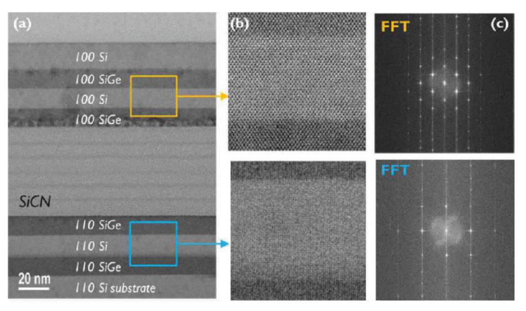 Imec成功地将该eMDI模块集成到完整的mCFET工艺流程中,并展示了具有不同沟道取向的功能性顶层器件:(100)硅顶层nFET、(100)和(110)硅顶层pFET。这些顶层器件采用正面连接方式制造(图6)。