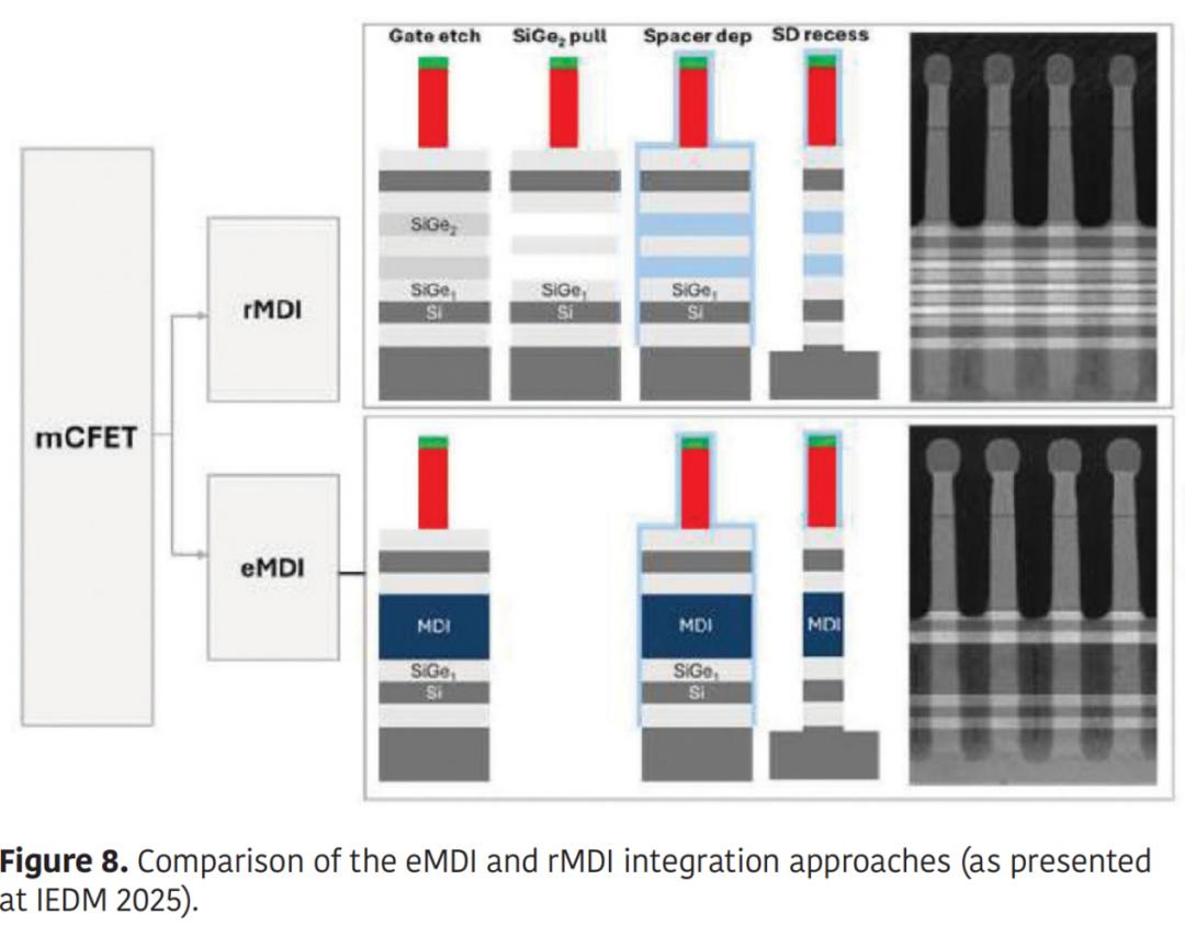 在 IEDM 2025 上,imec 通过实验演示了关键模块:嵌入式 MDI 模块,该模块允许在 mCFET 工艺流程中集成不同方向的顶部 nMOS 器件和底部 pMOS 器件的沟道。