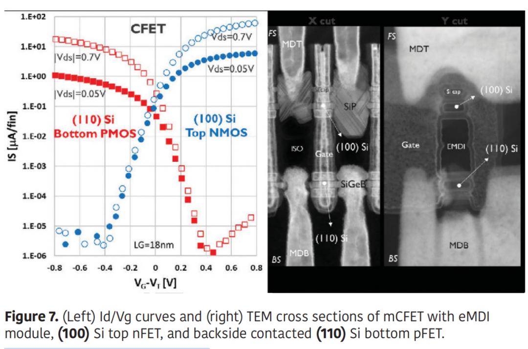 随后,集成流程进一步扩展,实现了与mCFET底部器件的直接背面接触。imec CFET团队展示了具有集成eMDI模块、正面连接的(100) Si顶部nFET以及直接背面接触的(110) Si pFET的功能性mCFET器件(图7)。