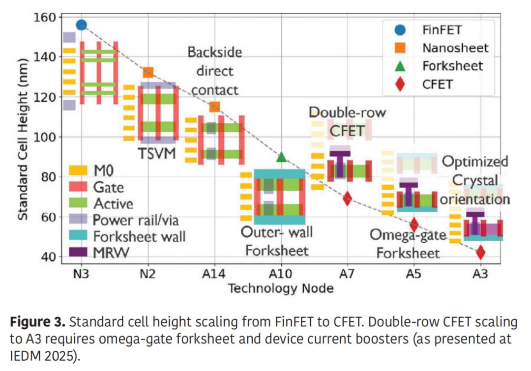 Imec 通过一项 DTCO 研究确定了支持跨多个技术节点的 mCFET 器件架构进行激进面积缩放所需的性能提升措施。虽然最小化寄生栅极电容对于 A7 节点至关重要,但 A5 和 A3 节点将引入带有 Ω 形栅极的外壁叉形结构以及 M0 电源轨。
