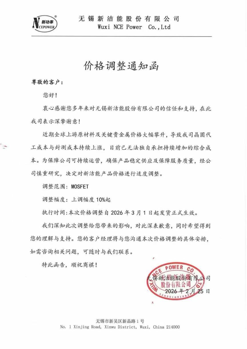 近日,国内功率半导体设计龙头新洁能(605111.SH)发布涨价函,宣布公司对MOSFET产品进行价格上调,上调幅度10%起,此次价格调整自2026年3月1日起发货正式生效。