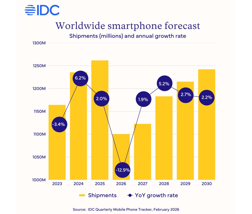 IDC预测2026年智能手机销量将大幅下滑。图片来源:IDC