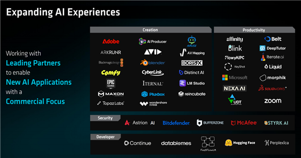AMD AI生态正在迅速扩大,已有大量创作、办公等生产力软件支持优化,包括不少商用软件。