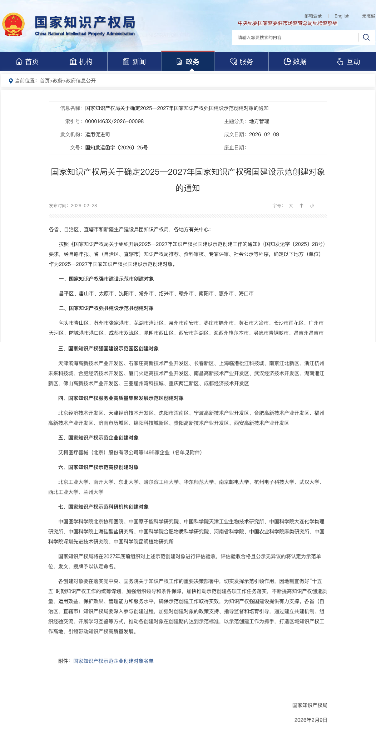 根据创建工作安排,创建周期(2025-2027)结束后,国家知识产权局将对创建对象单位的知识产权相关工作进行全面评估与验收。验收合格后,相关单位将被正式认定为“国家知识产权示范企业”。