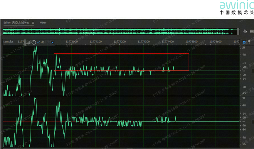 此类底噪杂音较为隐蔽,易被音频工作人员忽略。其典型现象为:播放音频时底噪声明显偏大,但单独试听音源本身无任何异常,且在低音量播放时,底噪会更加突出,其典型波形如图所示: