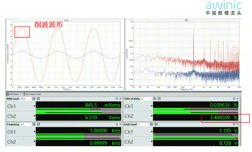 超出额定值的部分会形成削波失真。针对此类问题,艾为功放的AGC(自动增益控制)技术可实现有效改善,具体效果可参考如下截图: