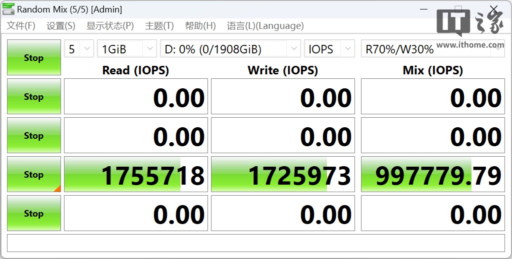 为了进一步探究贴近消费者真实日常的复杂工况,IT之家引入了 4K Q1T1 条件下的“七读三写”(70% 读取与 30% 写入)混合负载测试。在实际的系统运行中,诸如启动大型生产力软件、加载 3A 游戏场景或渲染无缝大地图时,硬盘面临的往往不是单纯地持续读写,而是伴随着大量 4KiB 超小文件的并发混合存取,其中读取指令通常占据主导,且硬盘需要极其频繁地在读、写两种工作状态间切换。