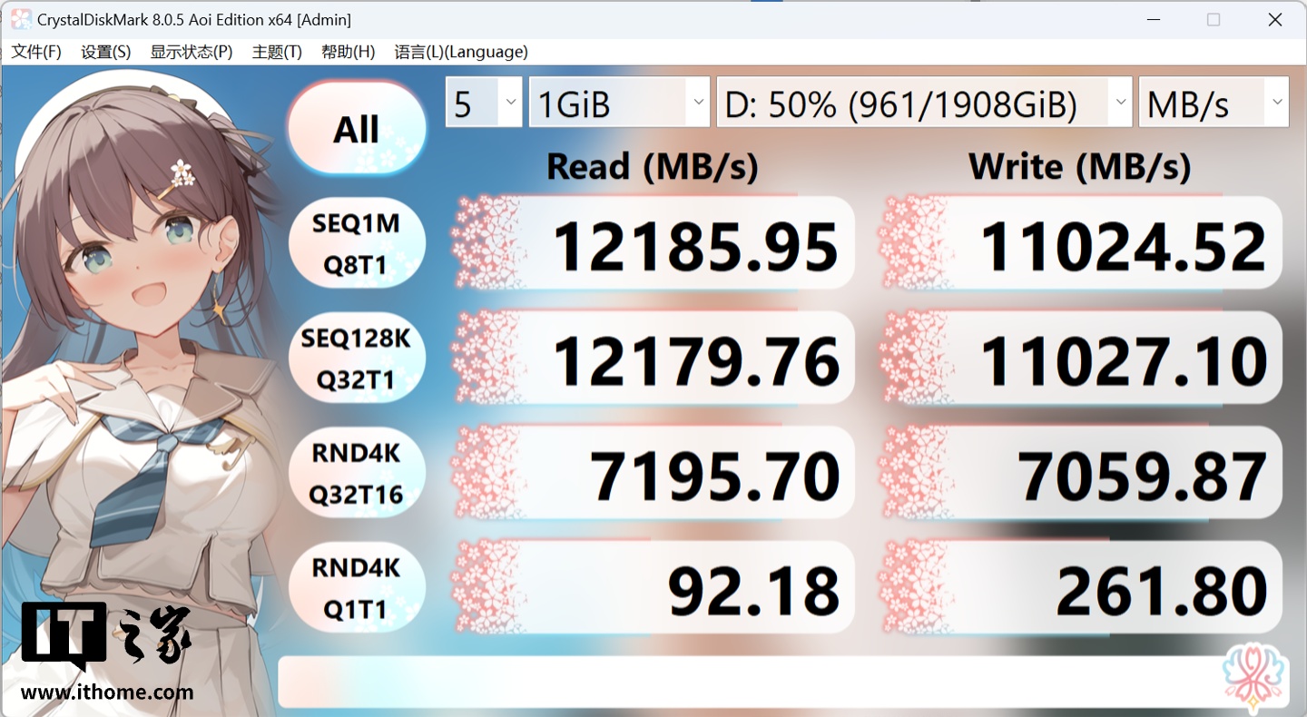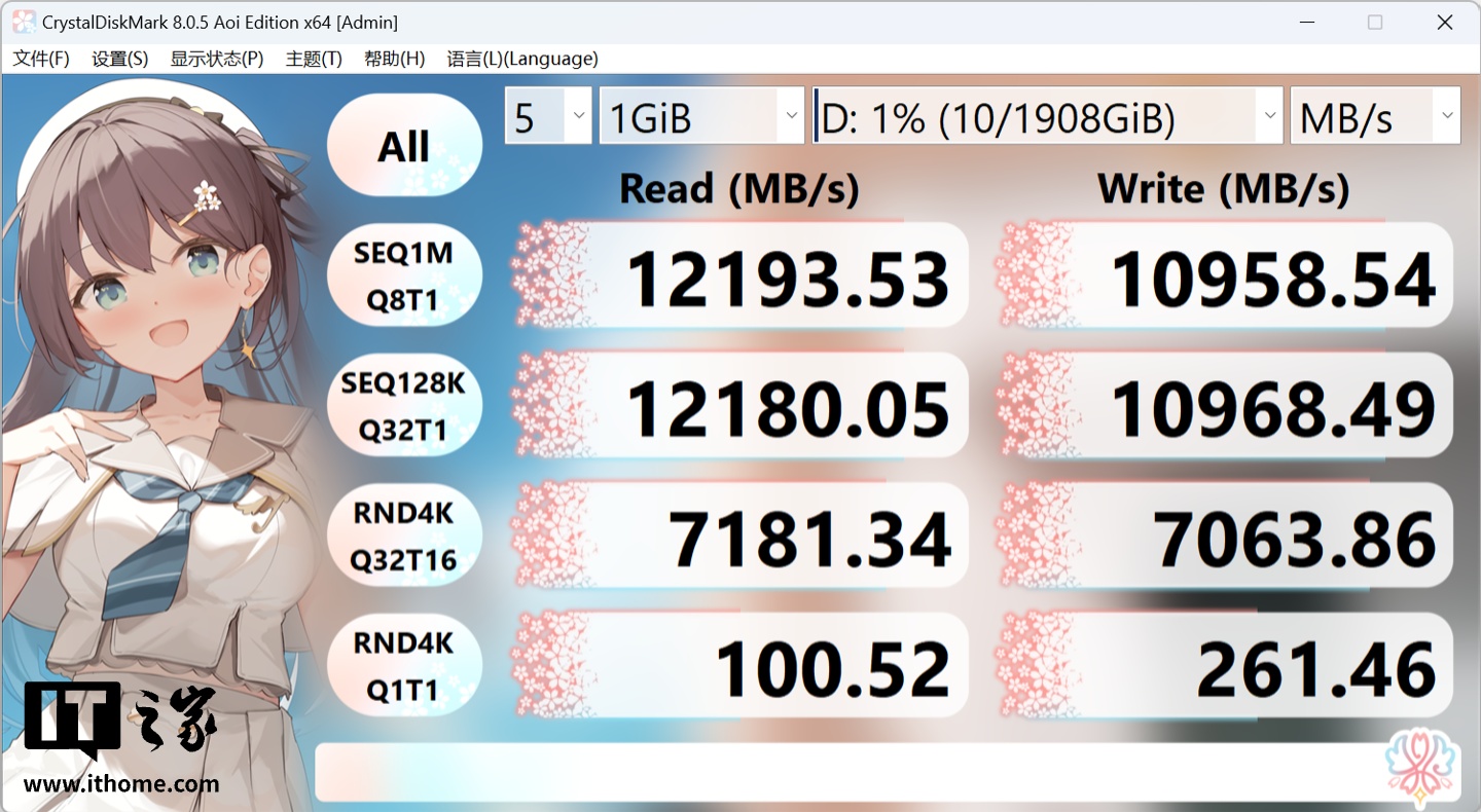 相较于目前主流的 PCIe 4.0 旗舰固态硬盘,其读写成绩分别高出约 5100MB/s 和 3400MB/s,代际提升优势显著。