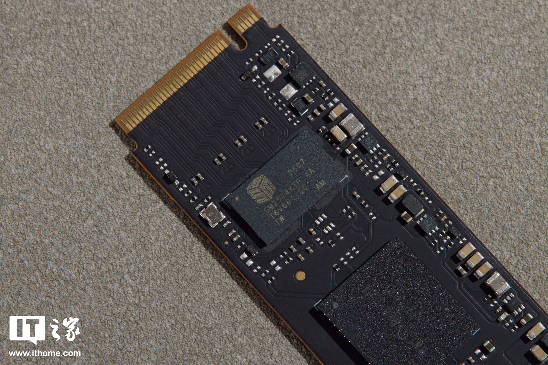细节上,靠近 M.2 金手指接口一侧的核心元器件为固态硬盘主控芯片。芯片表面的微距实拍丝印显示型号为 SM2504XT,这是来自慧荣科技的新一代 PCIe 5.0 主控。