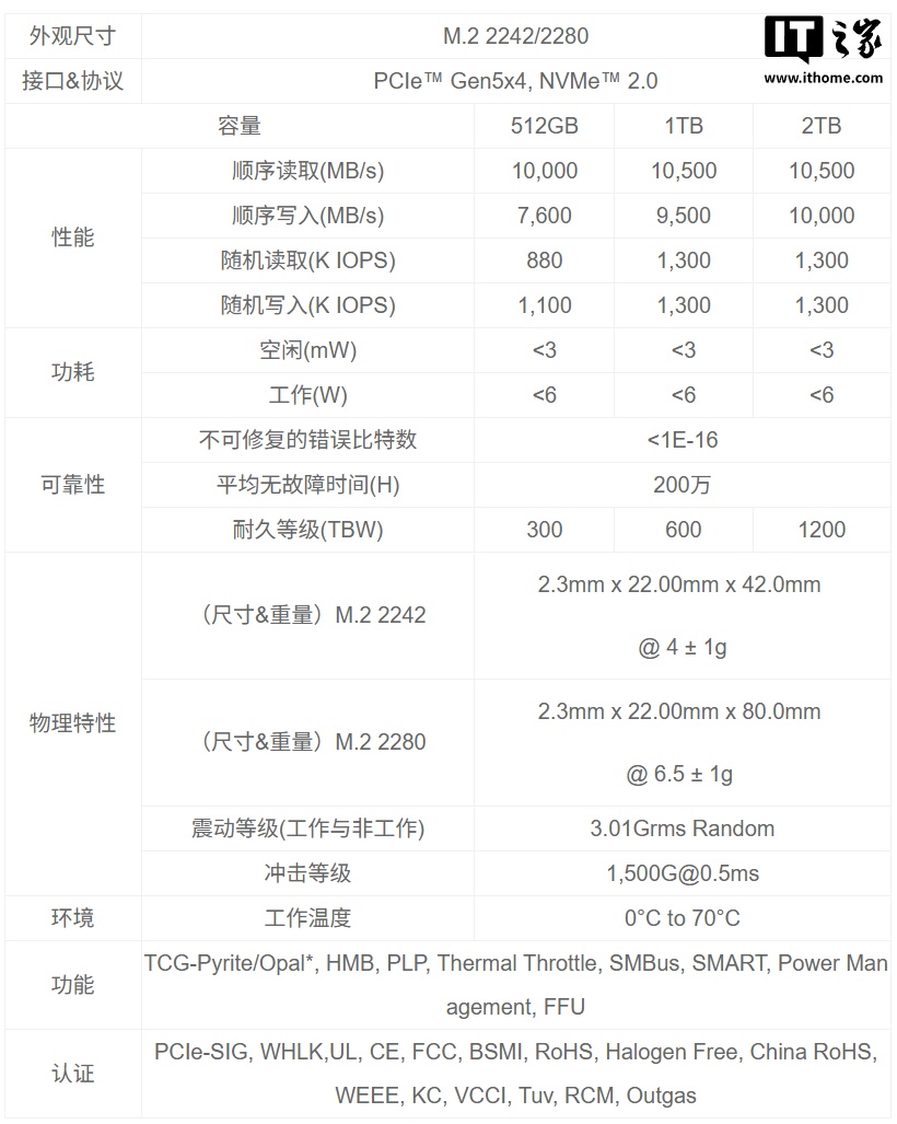 PC550 可选 2242 和 2280 两种尺寸规格,IT之家附参数表如下: