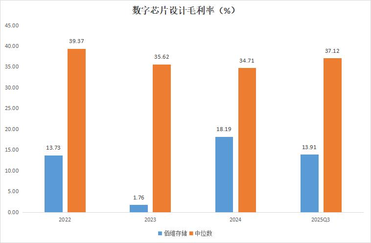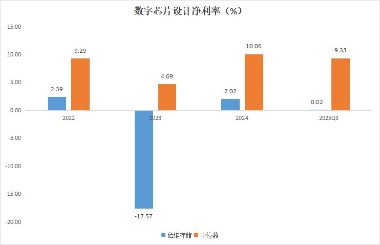 2022年至2024年及2025年前三季度,佰维存储净利率分别为2.39%、-17.57%、2.02%和0.02%;同期申万数字芯片设计行业中位数则为9.29%、4.69%、10.06%和9.33%。