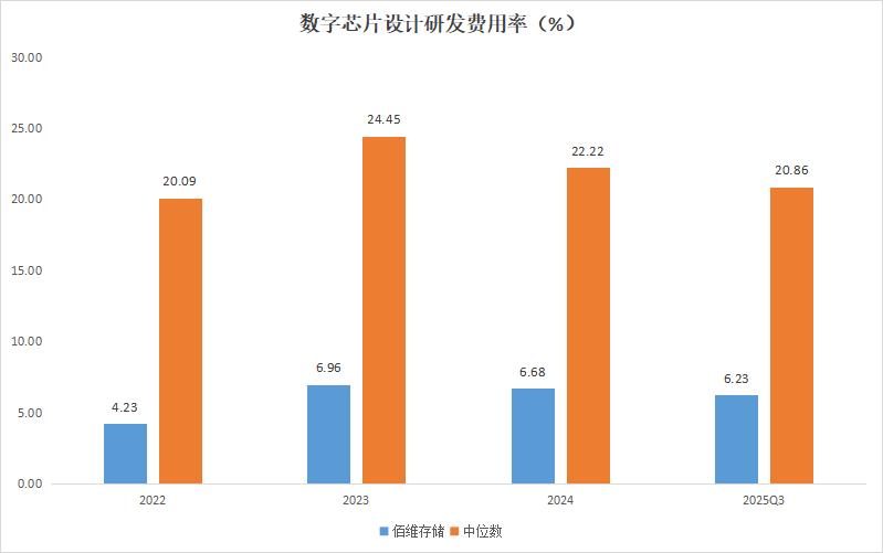 2022-2024年及2025年前三季度,佰维存储的研发费用率只有4.23%、6.96%、6.68%和6.23%,相比之下,申万数字芯片设计行业的中位数分别高达20.09%、24.45%、22.22%和20.86%。可以说,佰维存储的研发投入力度,连行业的一半都没有达到。