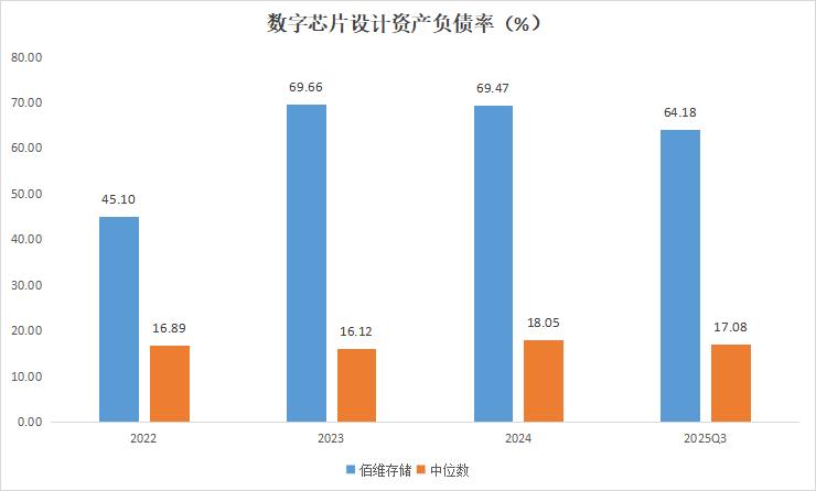 目前,佰维存储的杠杆水平明显高于申万数字芯片设计行业整体。2022年至2024年及2025年前三季度,公司资产负债率分别为45.1%、69.66%、69.47%和64.18%;同期行业中位数仅为16.89%、16.12%、18.05%和17.08%。