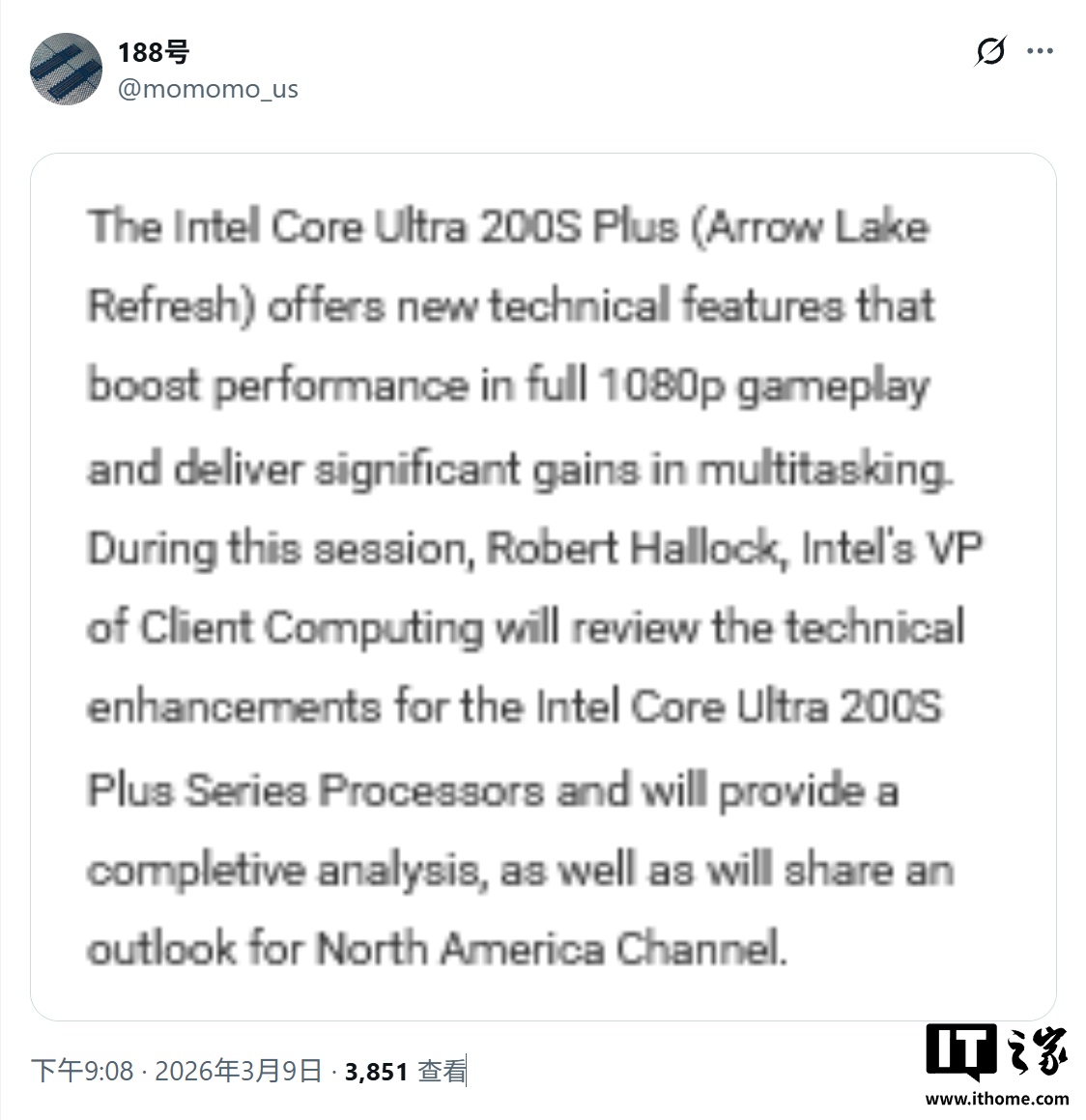 IT之家 3 月 10 日消息,消息源 @momomo_us 昨日(3 月 9 日)在 X 平台发布推文,分享了一张英特尔内部会议截图,展示了英特尔酷睿 Ultra 200S Plus(即 Arrow Lake Refresh)处理器的相关特性。