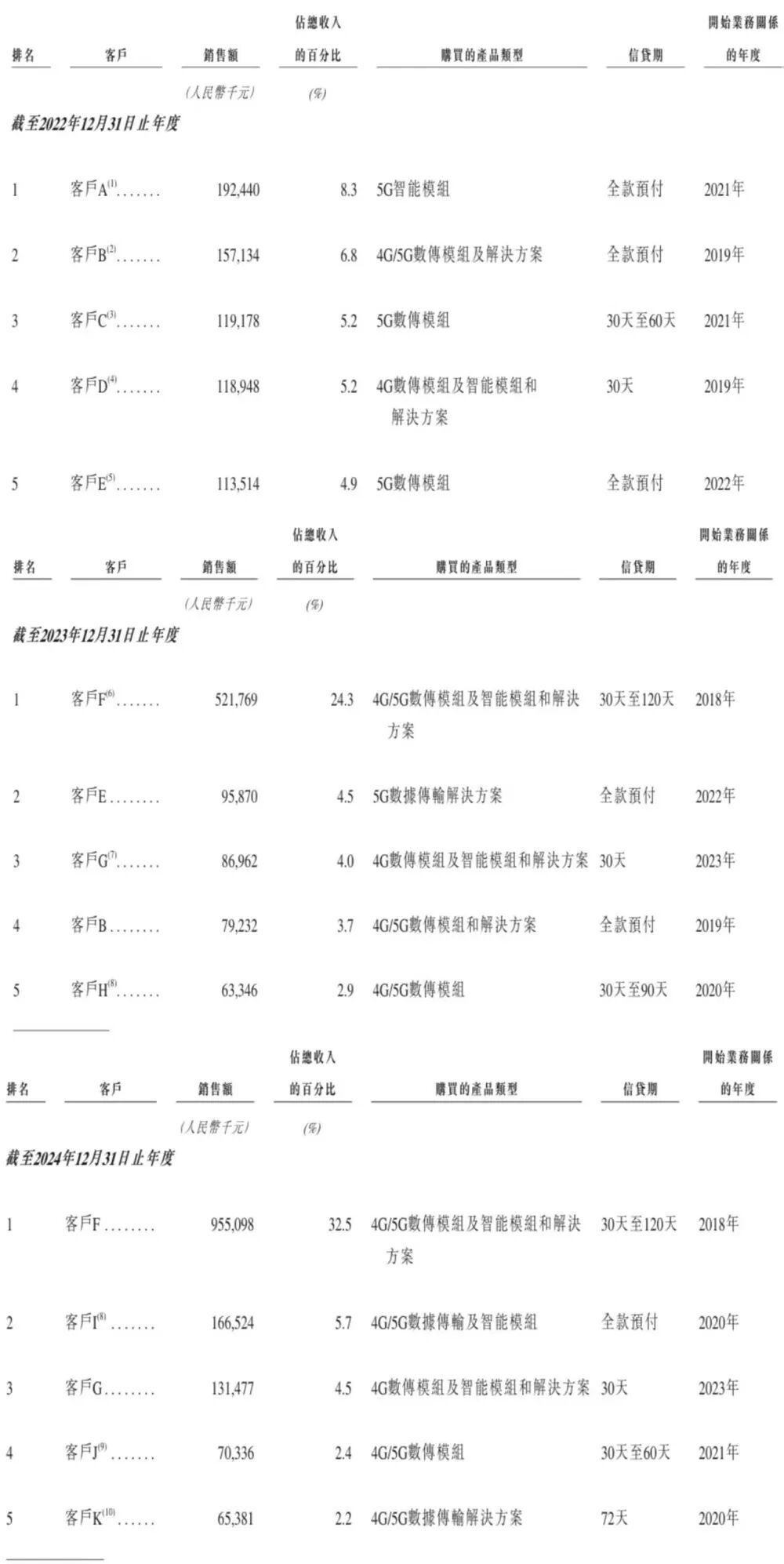 2022年-2024年,美格智能来自前五大客户的收入分别为7.0亿元、8.5亿元及13.9亿元,分别占同期总收入的30.4%、39.5%及47.2%。