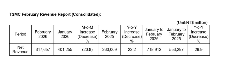 凤凰网科技讯 3月10日,台积电发布2026年2月营收公告。台积电2月销售额3176.6亿元台币(现汇率约合701.7亿元人民币),同比增长22.2%。1-2月累计销售额7189.1亿元台币(现汇率约合1588.08亿元人民币),同比增长29.9%。