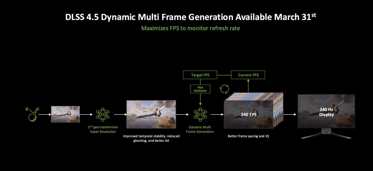 英伟达在发布会上宣布,RTX 50 系显卡玩家从 3 月 31 日起,可通过 NVIDIA App Beta 版启用六倍多帧生成、动态多帧生成两项功能,不过启用前需确保 Game Ready 驱动处于 595.79 WHQL 或更高版本。