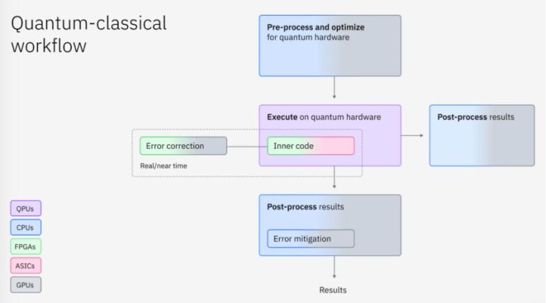 IBM则采取了更为激进的商业化策略。IBM提出了“以量子为中心的超级计算机”概念,将量子处理器、CPU和GPU整合到同一个计算结构中。用QPU解决负责处理那些需要指数级经典内存才能模拟的量子线路。