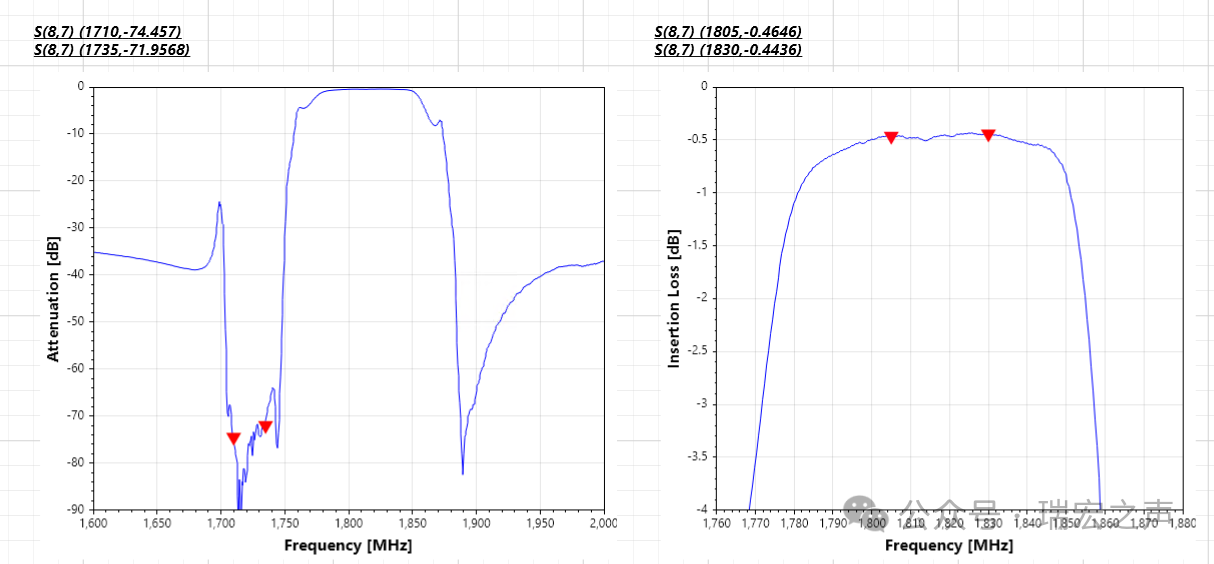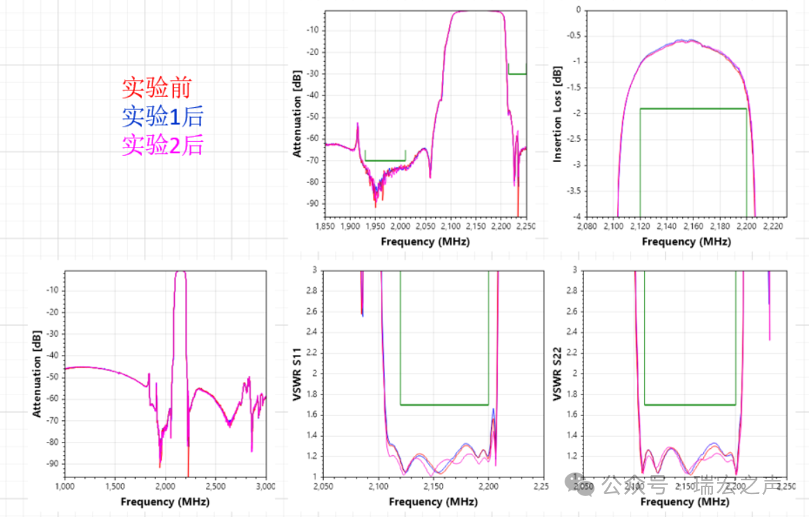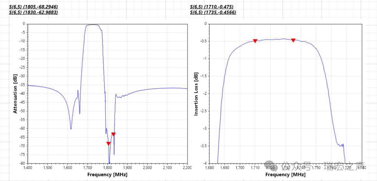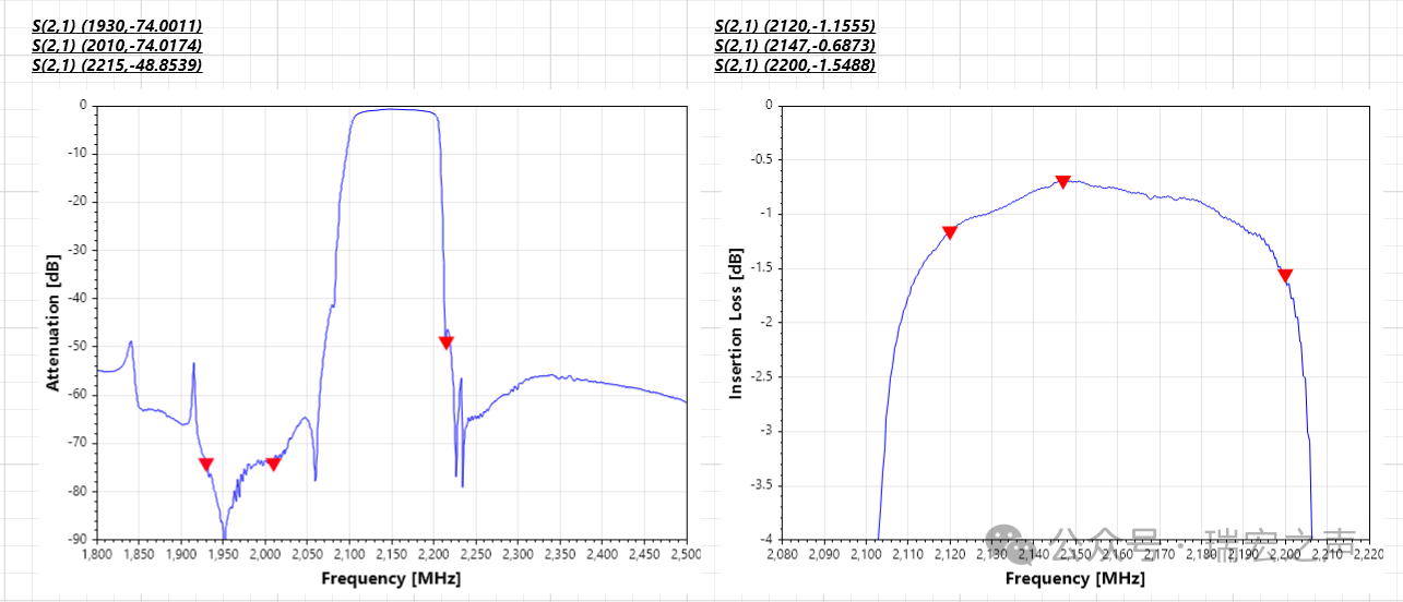除发射通道的高抑制大功率滤波器外,瑞宏同步还推出与之配套的接收通道低损耗SAW滤波器,通带:1930~2010MHz,抑制60db+,通带平均插损小于1db,满足2025近端20db+抑制要求。