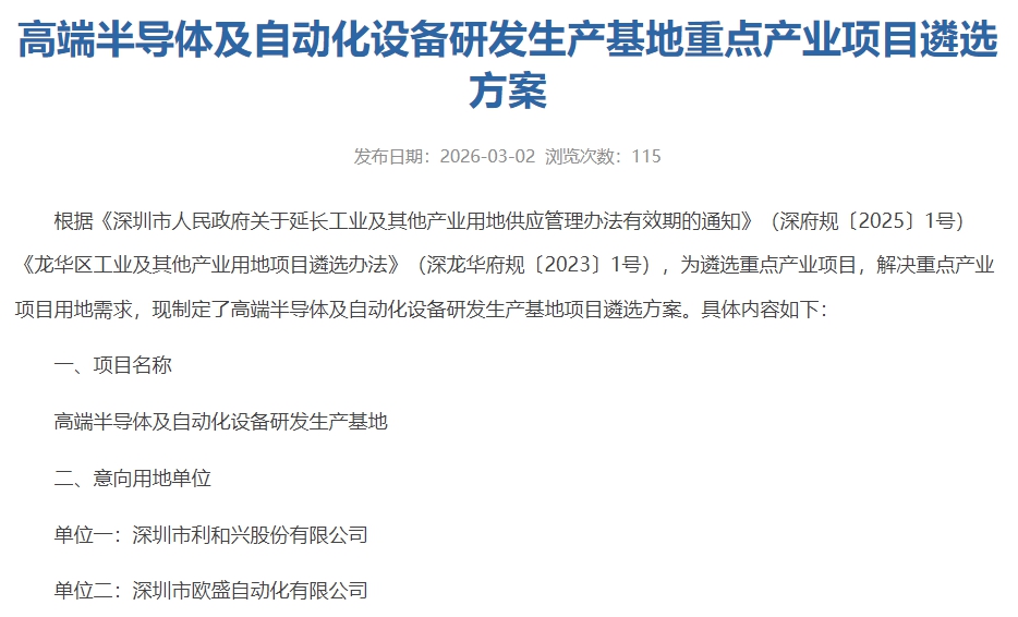 3月2日,深圳市龙华区工业和信息化局发布《高端半导体及自动化设备研发生产基地重点产业项目遴选方案》。根据方案,深圳市利和兴股份有限公司与深圳市欧盛自动化有限公司将组成联合体,在龙华区建设高端半导体及自动化设备研发生产基地项目,项目用地面积约2.4公顷,计容建筑面积约11.06万平方米。