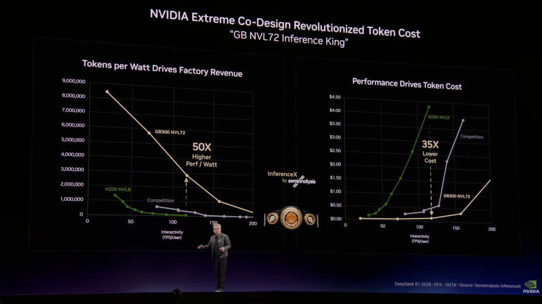 黄仁勋曾宣称 Grace Blackwell NVLink 72 每瓦性能提升 35 倍,当时没人相信他。后来 SemiAnalysis 发布评测报告,分析师 Dylan Patel 说黄仁勋说得太保守了,实际提升是 50 倍。