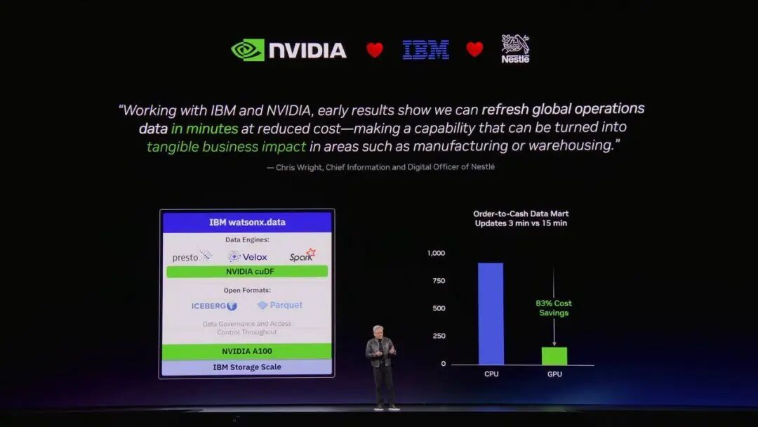 两个工具库的效果也是相当明显。黄仁勋举了非常多合作伙伴的例子,其中提到雀巢公司每天要处理覆盖 185 个国家的庞大供应链数据,在换上英伟达加速的 IBM Watsonx.data 后,速度飙升了 5 倍,成本却骤降了 83%。