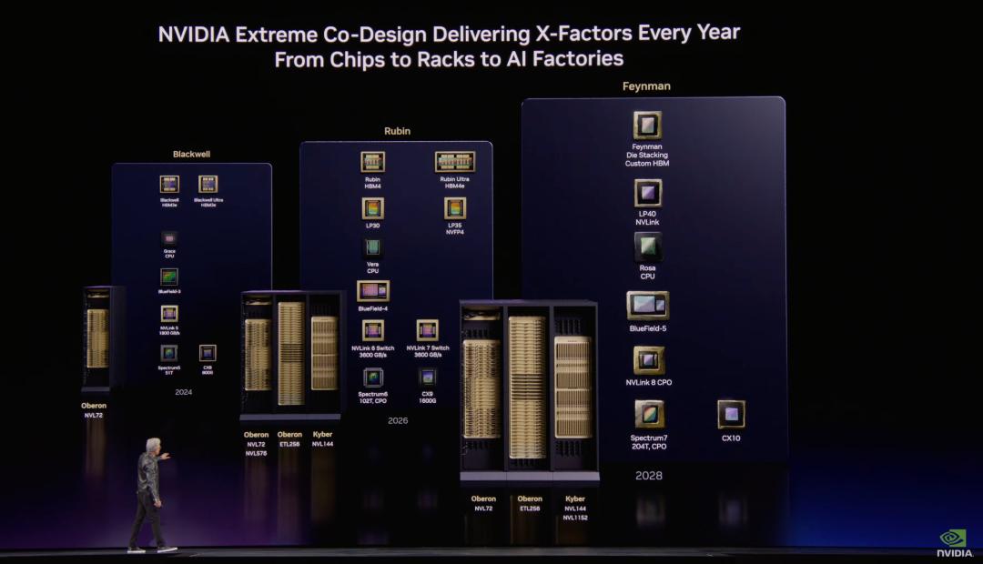 6)Feynman:全新GPU + LP40(LPU)+ Rosa CPU(以Rosalind命名)+ BlueField-5 + CX10。