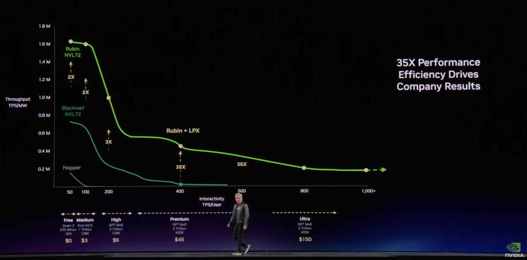 以1GW数据中心为例,每25%功率分配一个层级:Grace Blackwell可比Hopper生成5倍收入,Vera Rubin可再提升5倍。
