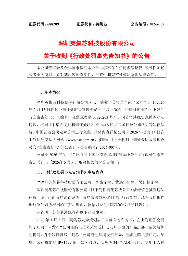 3月17日晚间,英集芯公告称,于当日收到中国证监会深圳监管局(简称“深圳证监局”)下发的《行政处罚事先告知书》。经查实,2026年1月初,英集芯为蹭“脑机接口”这一热门赛道,于上海证券交易所e互动平台人为策划“自问自答”。