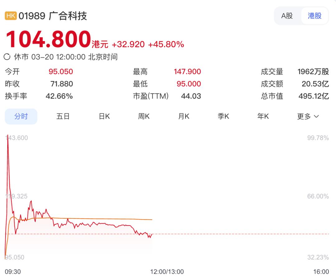 3月20日,广合科技正式在港交所主板挂牌上市,发行价为每股71.88港元,开盘涨32.23%至95.05港元,总市值450亿港元;截至午间休盘,每股涨45.8%至104.8港元,总市值495.12亿。