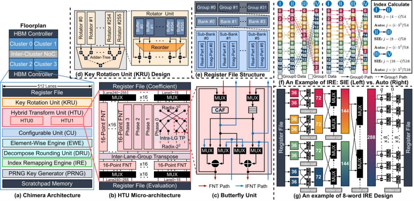 该论文第一作者是实验室在读研究生华腾辉,通讯作者和合作者包括穆嘉楠特别研究助理、叶靖副研究员和李华伟研究员等。为了提升FHE加速器通用性,需要探索统一架构支持不同加密体系。针对现有统一FHE加速器普遍存在兼容性不足、硬件利用率不高以及关键路径性能受限等问题,研究团队提出了新型统一加速器 Chimera。面向多样化 FHE 工作负载在计算模式、数据组织与资源需求上的显著差异,Chimera 从计算架构、功能单元、存储组织以及配置优化等多个层面开展协同设计,在保持统一架构通用性的基础上,显著增强了对复杂逻辑型 FHE 计算的支持能力。与此同时,Chimera 还结合面向系统约束的自动化配置优化方法,能够根据算法参数和硬件配置对运行参数进行协调优化,从而进一步提升整体执行效率与硬件资源利用水平。实验结果表明,与当前先进的统一 FHE 加速器Trinity相比,Chimera 在 TFHE 类工作负载上平均实现 14.64×的性能提升,同时在 CKKS 类工作负载上保持可比性能,且面积开销仅增加 9.6%。该工作展示了统一 FHE 加速器在兼顾通用性、高性能与可扩展性方面的显著潜力,为高效支撑多体系 FHE 应用提供了新的技术路径。