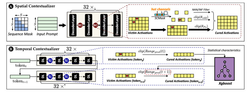 该论文第一作者为实验室集成电路课题组博士生张仁刚,通讯作者为刘自臻特别研究助理和李华伟研究员。针对大语言模型(LLM)在安全关键领域部署时面临的软错误威胁,研究团队提出了一种轻量级的时空激活上下文感知容错推理框架STAC。现有低成本防御方法普遍依赖静态阈值,难以适配LLM推理过程中独特的“异常值二分性”问题:高幅值激活既可能是语义表达所必需的功能性异常,也可能源于软错误引发的故障性异常。此外,LLM推理中预填充阶段存在结构化功能异常,解码阶段激活特征随自回归过程发生时间漂移,静态阈值难以同时兼顾两者。为此,团队提出STAC框架,采用“空间感知+时间预测”的解耦机制:预填充阶段利用热点通道掩码区分合法的大数值功能异常,对冷通道严格裁剪;解码阶段提取轻量级统计特征构建XGBoost动态预测器,自适应调整每个token的保护边界。实验表明,STAC在保持无故障精度的同时,将最大可容忍故障率提升至10-6,相比现有低成本防御方法实现10倍可靠性提升,平均延迟开销仅3.85%。该工作基于激活的时空演化特性构建自适应容错机制,在保证效率的同时显著提升系统可靠性,为大语言模型在安全关键场景中的部署提供了可行路径。