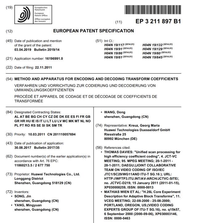 从起诉书上可以看到,华为这次指控的,是一个代号为EP3211897的涉案专利:“Method and apparatus for encoding and decoding transform coefficients”(变换系数编码和解码的方法和装置)
