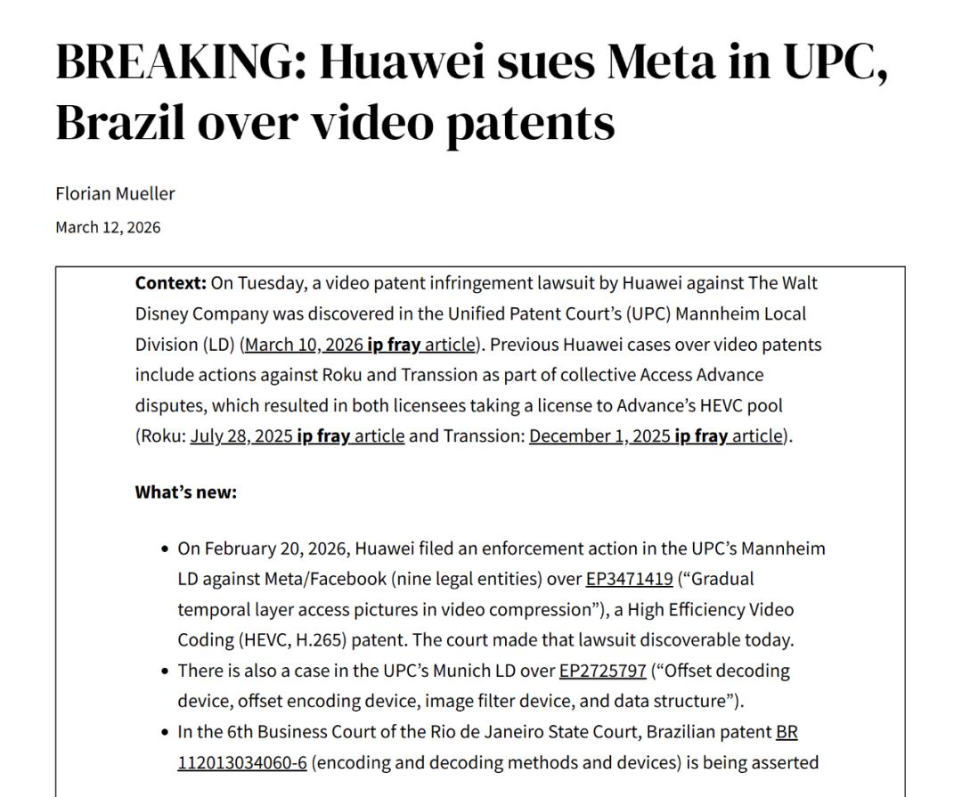 实际上,不止迪士尼,就在2026年3月,华为又在这个法院以及巴西,对Meta 也发起了新一轮的专利围剿。
