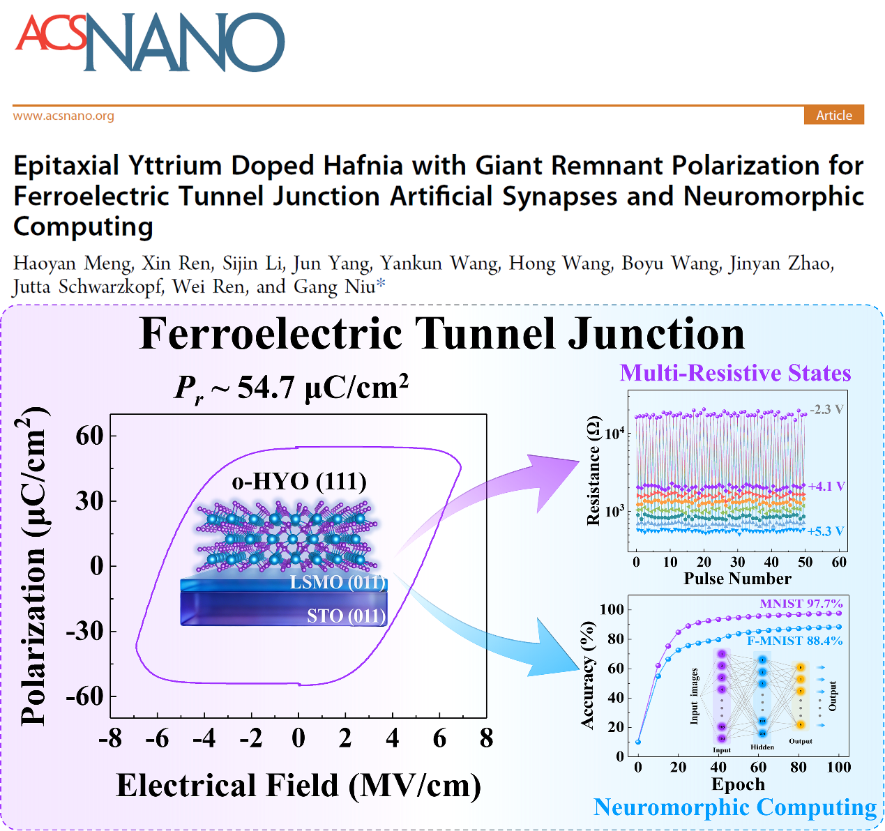 近日,该研究成果以《具有巨大剩余极化强度的外延钇掺杂氧化铪铁电隧道结用于人工突触和神经形态计算》(Epitaxial Yttrium Doped Hafnia with Giant Remnant Polarization for Ferroelectric Tunnel Junction Artificial Synapses and Neuromorphic Computing)为题,发表在国际著名期刊《美国化学学会·纳米》(ACS Nano)上。西安交通大学孟昊岩博士生为论文第一作者,电信学部牛刚教授为该论文的通讯作者,电信学部任巍教授、赵金燕副教授等为共同作者。论文的合作单位还包括德国莱布尼茨晶体生长研究所。