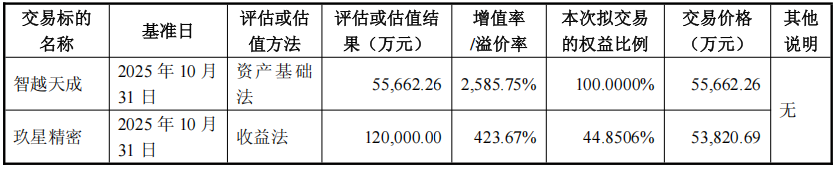 根据评估报告,截至评估基准日2025年10月31日,智越天成100%股权评估值为55,662.26万元,增值率为2,585.75%;玖星精密100%股权评估值为120,000万元,增值率为423.67%。经交易各方协商,胡涛、万红娟所持智越天成合计100%股权(对应玖星精密46.1165%股权)交易对价为55,662.26万元,胡涛、傅黎明等10名交易对方所持玖星精密合计44.8506%股权交易对价为53,820.69万元。