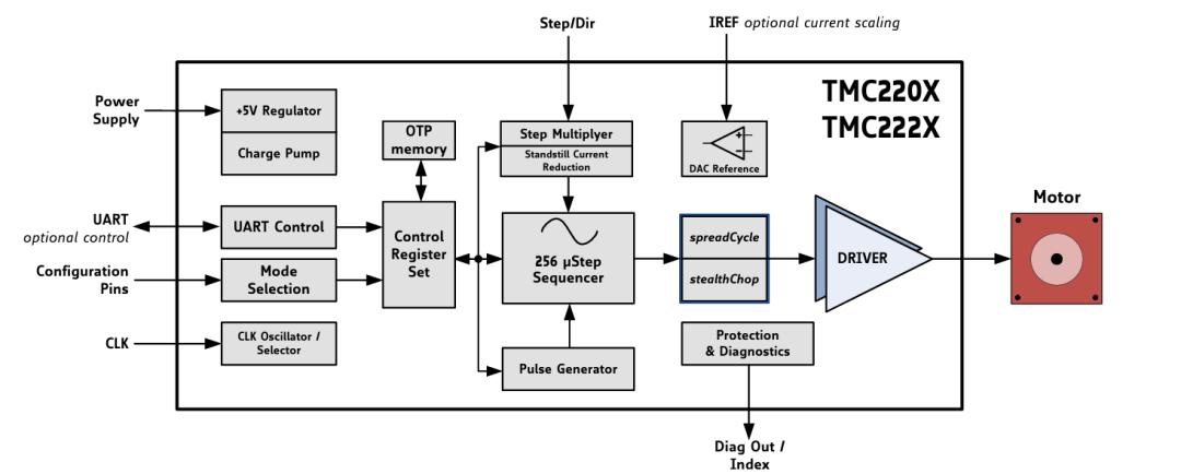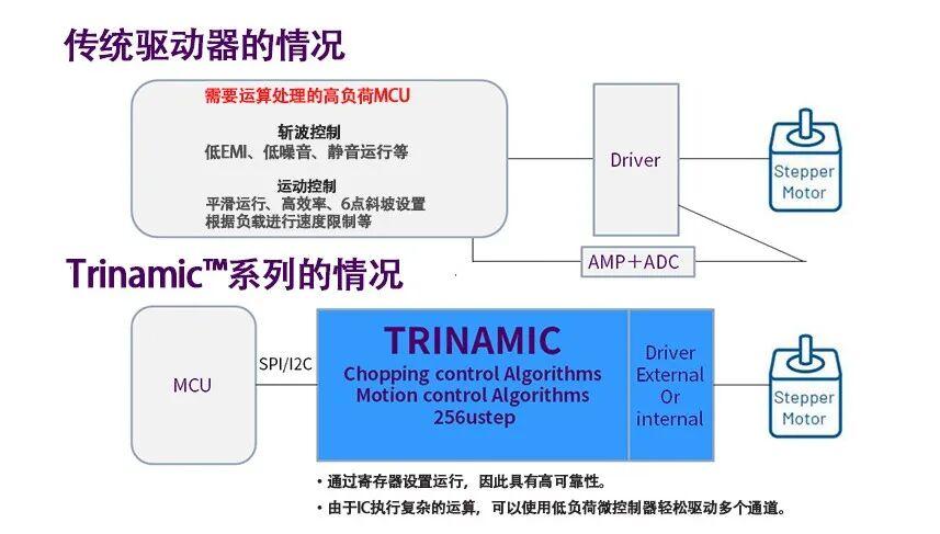 值得注意的是,Trinamic优势还有很多。相比传统电机驱动器需要开发者自行编写控制算法并将其嵌入MCU中,同时还需要设计功率级电路,Trinamic将复杂的控制算法集成到硬件中,开发者只需动态更改寄存器设置即可实现高性能电机。由于无需编写复杂的算术处理,因此可以轻松开发多个通道的同步作业。此外,Trinamic系列还提供内置功率级。